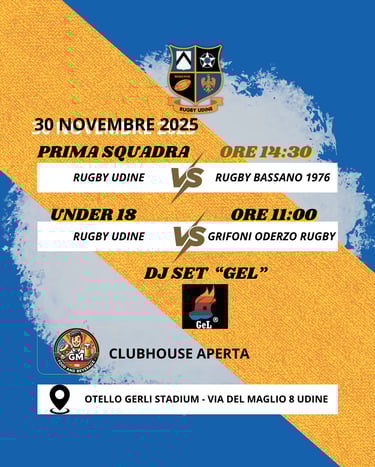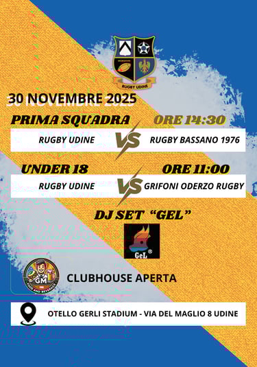🏉 Super Domenica in casa RUGBY UDINE! Il 30 novembre vi aspettiamo all’Otello Gerli Stadium 🔥 🕚 Ore 11:00 – Under 18 Rugby Udine vs Grifoni Oderzo Rugby 🕝 Ore 14:30 – Prima Squadra Rugby Udine vs Rugby Bassano 1976 🎶 DJ set “GeL” per accompagnare la giornata 🍻 Clubhouse aperta pre e post partita con GM FOOD 📍 Via del Maglio 8, Udine 👉 Non perderti l’evento: vieni a tifare dal vivo! #RugbyUdine #MatchDay #Under18 #PrimaSquadra #RugbyFamily